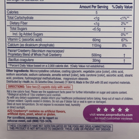 Urinary Pain Relief AZO® Vitamin C 60mg Calcium 110 mg Cranberry 500 mg Bacillus Coagulans 30 mg Tablet 50 per Box
