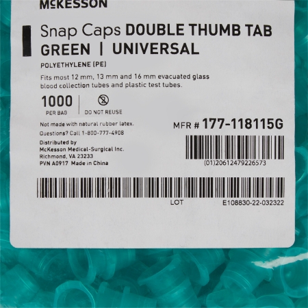 McKesson Tube Closure Polyethylene Snap Cap Green 12 mm / 13 mm / 16 mm (Universal) Fits Most 12mm 13mm and 16mm Evacuated Glass Blood Collection Tubes and Plastic Test Tubes NonSterile