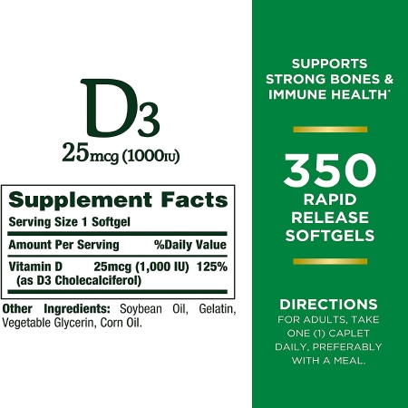 Vitamin Supplement Nature’s Bounty® D3 1 000 IU Strength Softgel 350 per Bottle
