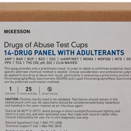 Drugs of Abuse Test Kit McKesson AMP BAR BUP BZO COC mAMP/MET MDMA MOP300 MTD OXY PCP PPX TCA THC (OX pH SG) 25 Tests CLIA Waived