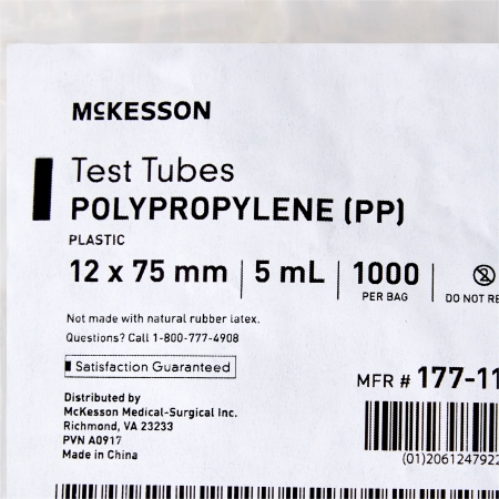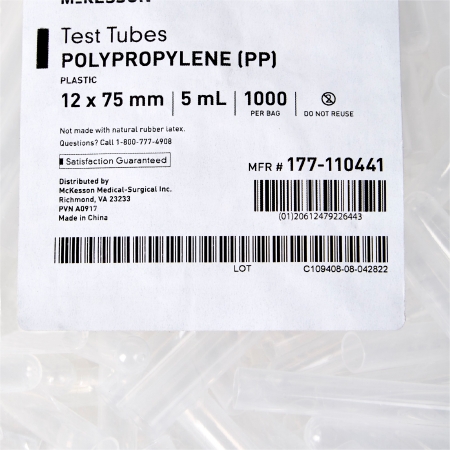 McKesson Test Tube Plain 5 mL Without Closure Polypropylene Tube