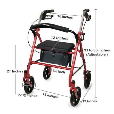 4 Wheel Rollator McKesson Red Adjustable Height / Folding Steel FrameProduct Specification Sheet
